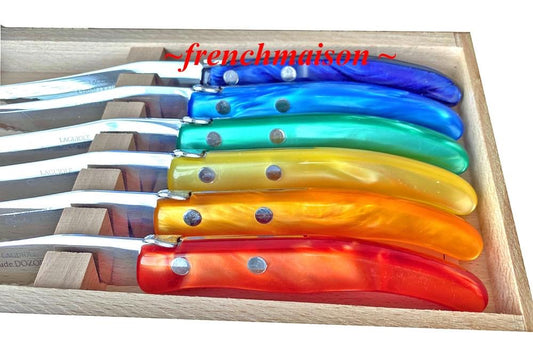 CLAUDE DOZORME Laguiole French Rainbow Multicolor 6 STEAK KNIFE Set Gift Box